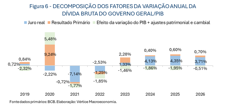 A figura 5 mostra a evolução observada e projetada da DBGG/PIB, desde 2019 até 2026. Já a figura 6 abre as causas dessa variação em três componentes: 1) resultado primário; 2) juros reais (valores ajustados pelo Deflator do PIB) e 3) efeitos do crescimento real do PIB e de ajustes patrimoniais e cambiais.