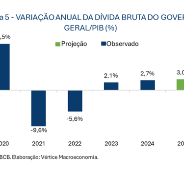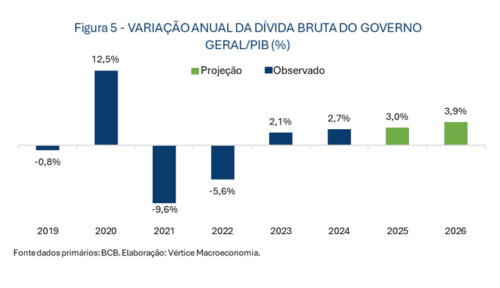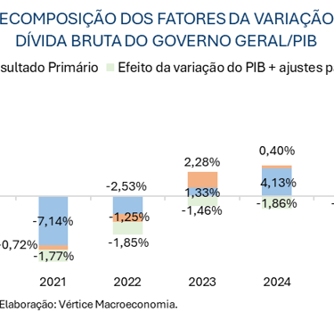 Além disso, há o efeito fiscal de uma política monetária excessivamente contracionista. O crescimento da Dívida Bruta do Governo Geral (DBGG) em relação ao PIB, observado e projetado até 2026, é explicado principalmente pelo enorme custo dos juros reais que vêm sendo praticados nos últimos dois anos e deverão continuar muito acima da taxa neutra até o final do próximo ano.