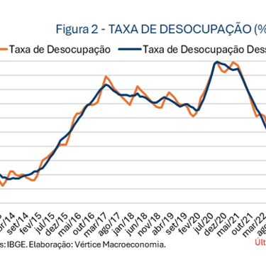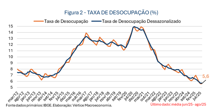 Em tese, o comportamento dos Serviços Subjacentes deve ser influenciado principalmente pelo maior ou menor aquecimento no mercado de trabalho, ou dito de forma mais técnica, pelo diferencial entre a taxa de desocupação observada e a taxa neutra (NAIRU), ou seja, aquela compatível com a inflação convergindo para a meta. No trimestre encerrado em agosto de 2025, a taxa média de desocupação (Figura 2) chegou ao seu nível histórico mais baixo (5,6%, ou 5,8%, com ajuste sazonal), o que justificaria a manutenção da enorme taxa Selic real de aproximadamente 10% ao ano, por um período bastante prolongado, conforme tem sido reiteradamente declarado pelo Banco Central (BC).