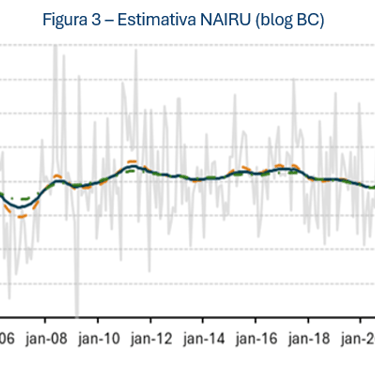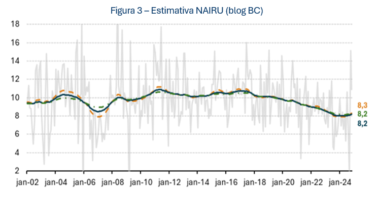 Em março de 2025, em uma publicação do BC (O nível recente da inflação de serviços deveria causar surpresa?), foi apresentada uma estimativa da NAIRU para três níveis do coeficiente de inércia (Figura 3). Observe-se que nesse estudo, desde 2017, a NAIRU teria caído de seu nível histórico em torno de 10%, para 8,2%.