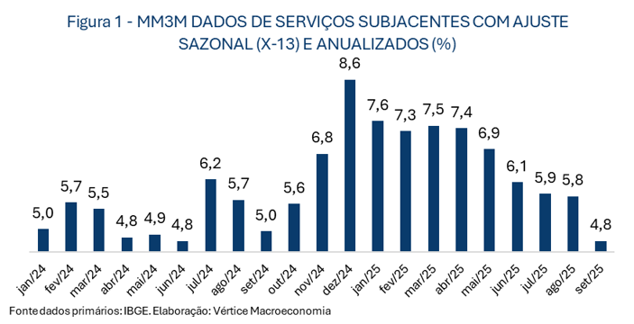 Amanhã (24) será divulgado o IPCA-15 relativo ao mês de outubro de 2025. A expectativa mediana do mercado financeiro é de variação de 0,17% (nossa projeção é de 0,20%) em relação ao mês anterior. Desde maio os Serviços Subjacentes, uma espécie de núcleo do grupo Serviços, que ao excluírem os itens voláteis mantêm maior correlação com o ciclo econômico, vêm apresentando comportamento benigno, com clara tendência decrescente (Figura 1). Outras medidas de núcleos também têm apresentado tendência semelhante.