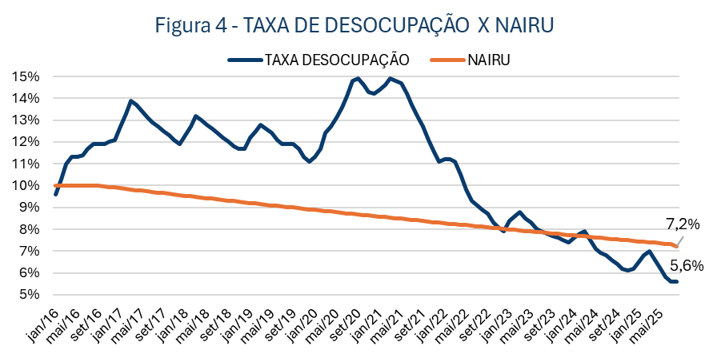 Mas é provável que a queda da NAIRU tenha sido maior do que a apresentada no estudo do BC. Em simulação recente que fizemos, utilizando filtro de Kalman, encontramos uma NAIRU próxima a 7,0%, no terceiro trimestre de 2025 (figura 4).
